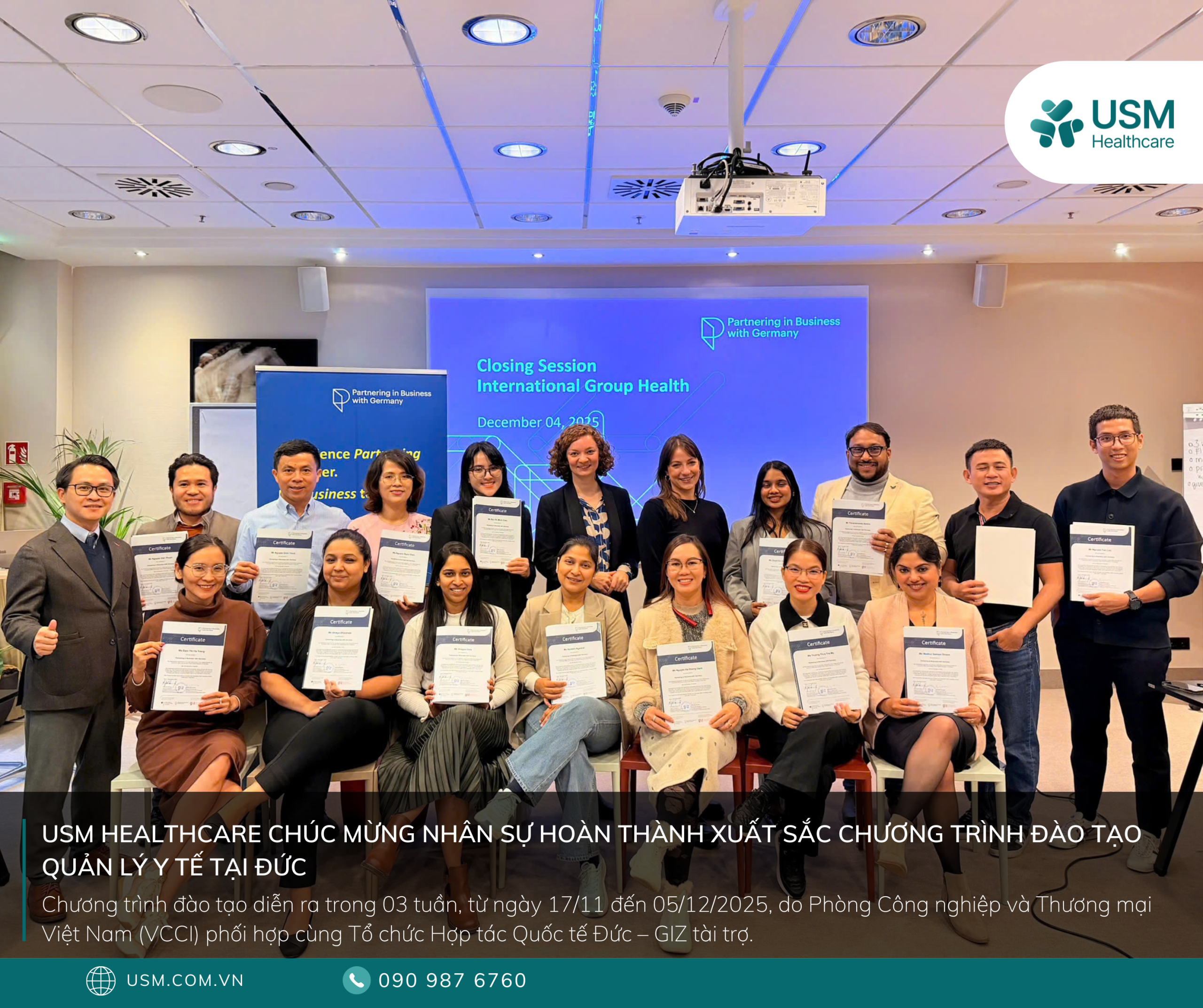 USM Healthcare trân trọng chúc mừng Anh Nguyễn Văn Thuận và Chị Trương Thụy Trà My đã hoàn thành xuất sắc Chương trình Đào tạo Quản lý Y tế Quốc tế (Healthcare Management Training Program) được tổ chức tại Cộng hòa Liên bang Đức. Đây là chương trình đào tạo chuyên sâu, có ý nghĩa quan trọng trong việc nâng cao năng lực quản lý, tư duy lãnh đạo và tầm nhìn quốc tế trong lĩnh vực y tế và chăm sóc sức khỏe.