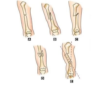 Figure 1: Types of fracture lines — A. Transverse B. Spiral C. Oblique D. Comminuted E. Segmental